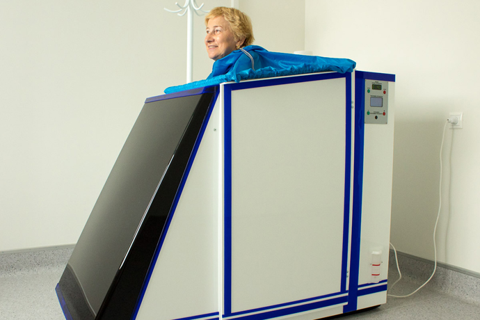 “Dry”, or carbon dioxide, baths act to regulate the functioning of the nervous system and improve the functionality of the cardio-respiratory system. The therapy results in mild reduction and stabilization of blood pressure and improvement of the external breathing function. An important mechanism of carbon dioxide bath's effect is the ability to improve the saturation of arterial capillary blood with oxygen. The change of functional status of the nervous system has a beneficial effect on the activity of many organs and systems of the body, in particular of the endocrine and the immune protection systems, as well on the regulation of exchange processes (reductive-oxidative, electrolyte, carbohydrate, fat metabolism, etc.).